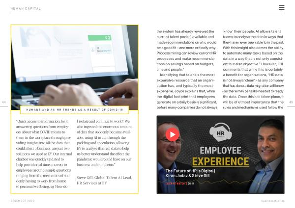 “ Quick access to information , be it answering questions from employees about what COVID means to them in the workplace through providing insights into all the data that could affect a business , are just two solutions we used at EY . Our internal chatbot was quickly updated to help provide real time answers to employees around simple questions ranging from the mechanics of suddenly having to work from home to personal wellbeing , eg ‘ How do
