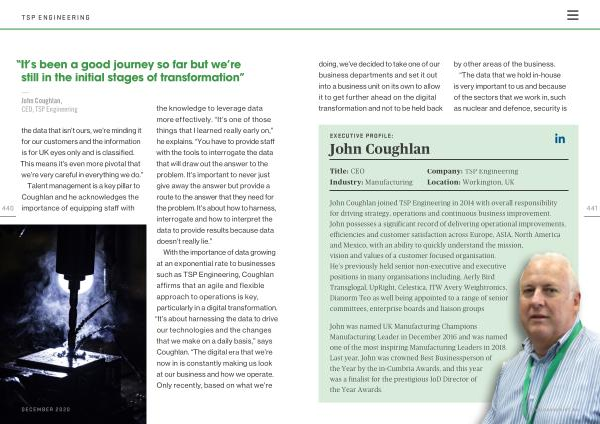 John Coughlan joined TSP Engineering in 2014 with overall responsibility for driving strategy , operations and continuous business improvement . John possesses a significant record of delivering operational improvements , efficiencies and customer satisfaction across Europe , ASIA , North America and Mexico , with an ability to quickly understand the mission , vision and values of a customer focused organisation . He ’ s previously held senior non-executive and executive positions in many organisations including , Aerly Bird Transglogal , UpRight , Celestica , ITW Avery Weightronics , Dianorm Teo as well being appointed to a range of senior committees , enterprise boards and liaison groups .