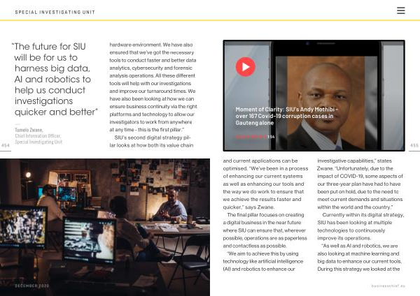 — Tumelo Zwane , Chief Information Officer , Special Investigating Unit hardware environment . We have also ensured that we ’ ve got the necessary tools to conduct faster and better data analytics , cybersecurity and forensic analysis operations . All these different tools will help with our investigations and improve our turnaround times . We have also been looking at how we can ensure business continuity via the right platforms and technology to allow our investigators to work from anywhere at any time - this is the first pillar .”