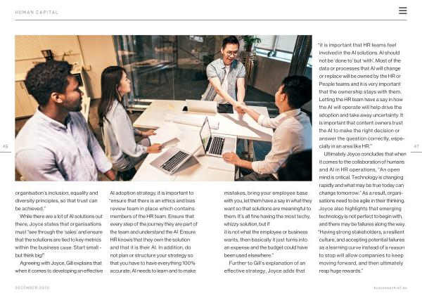 AI adoption strategy , it is important to “ ensure that there is an ethics and bias review team in place which contains members of the HR team . Ensure that every step of the journey they are part of the team and understand the AI . Ensure HR knows that they own the solution and that it is their AI . In addition , do not plan or structure your strategy so that you have to have everything 100 % accurate ; AI needs to learn and to make