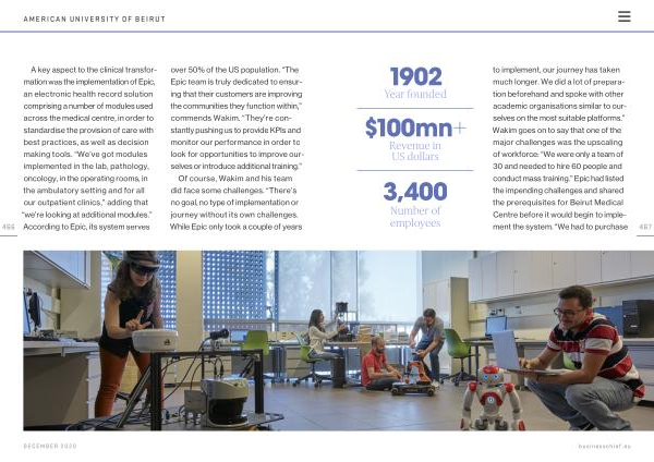 3,400 to implement , our journey has taken much longer . We did a lot of preparation beforehand and spoke with other academic organisations similar to ourselves on the most suitable platforms .” Wakim goes on to say that one of the major challenges was the upscaling of workforce : “ We were only a team of 30 and needed to hire 60 people and conduct mass training .” Epic had listed the impending challenges and shared the prerequisites for Beirut Medical