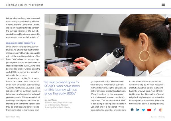 473 grow professionally .” He continues , “ Internally we will continue our commitment to improving the solutions to better serve our clinicians and patients . We will continue on this journey of automation until we are completely paperless . The success that AUBMC is achieving is setting the standard in Lebanon and it is no secret . “ We ’ ve been asked by a number of institutions to share some of our experiences , which we gladly do ; we ’ re an academic institution and we believe in sharing back the way we learn from others .” Wakim says that this sharing of knowledge is slowly having an impact on the industry nationally and the American University of Beirut is paving the way .