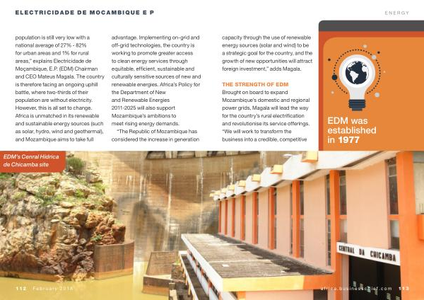 THE STRENGTH OF EDM Brought on board to expand Mozambique ’ s domestic and regional power grids , Magala will lead the way for the country ’ s rural electrification and revolutionise its service offerings . “ We will work to transform the business into a credible , competitive