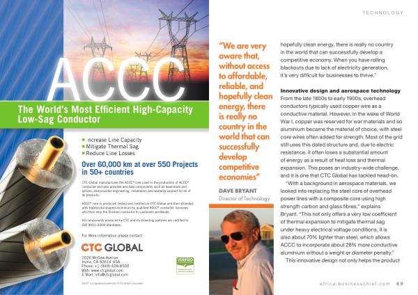 “ With a background in aerospace materials , we looked into replacing the steel core of overhead power lines with a composite core using high strength carbon and glass fibres ,” explains Bryant . “ This not only offers a very low coefficient of thermal expansion to mitigate thermal sag under heavy electrical voltage conditions , it is also about 70 % lighter than steel , which allows ACCC to incorporate about 28 % more conductive aluminium without a weight or diameter penalty .”