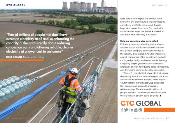 Helping societies stay connected Efficiency , capacity , reliability , and resilience are core values at CTC Global and it is these that give the company a competitive edge in the industry . CTC Global ’ s ACCC conductor is a small component of the electric grid , but with cutting-edge design and aerospace technology , it is giving people greater access to reliable , affordable energy , its reducing carbon emissions , and it ’ s helping communities stay connected .