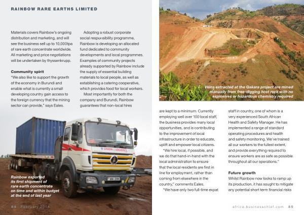 Community spirit “ We also like to support the growth of the economy in Burundi and enable what is currently a small developing country gain access to the foreign currency that the mining sector can provide ,” says Eales .