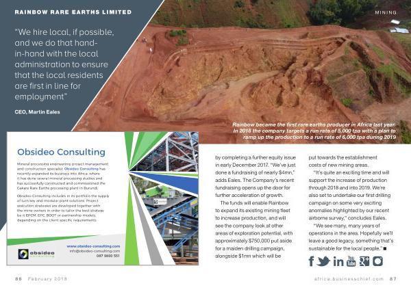 Mineral processing engineering , project management and construction specialist , Obsideo Consulting has recently expanded its business into Africa , where it has done several mineral processing studies and has successfully constructed and commissioned the Gakara Rare Earths processing plant in Burundi .
