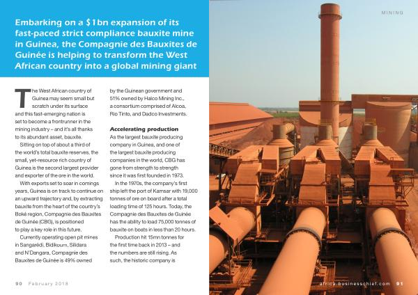 Embarking on a $ 1bn expansion of its fast-paced strict compliance bauxite mine in Guinea , the Compagnie des Bauxites de Guinée is helping to transform the West African country into a global mining giant