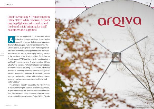 A rqiva is a supplier of critical communications infrastructure and media services . Having recently divested its telecoms business , it is now focusing on two market segments ; the Utilities sector , leveraging its smart metering and satellite data communications operations , and the media and broadcast sector , leveraging its long history in the provision of service to the UK ’ s Public Sector Broadcasters ( PSB ) and the broader media industry , as Chief Technology and Transformation Officer Clive White explains . “ We ’ re the leading broadcast provider in the UK covering TV and radio . That also extends to other digital delivery services through satellite and over the top services . The other focus area is more broadly called utilities , which today is a focus on smart metering across gas , electricity and water utilities .”