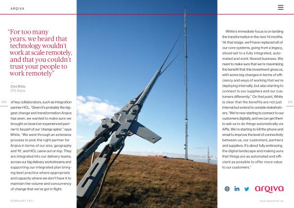 310 of key collaborators , such as integration partner HCL . “ Given it ’ s probably the biggest change and transformation Arqiva has seen , we wanted to make sure we brought on board an experienced partner to be part of our ‘ change spine ’,” says White . “ We went through an extensive process to pick the right partner for Arqiva in terms of our size , geography and ‘ fit ’, and HCL came out on top . They are integrated into our delivery teams , across our big delivery workstreams and supporting our integrated plan bringing best practice where appropriate and capacity where we don ’ t have it to maintain the volume and concurrency of change that we ’ ve got in flight .