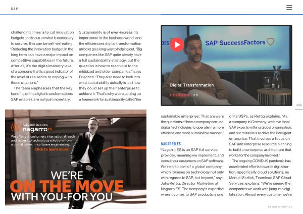 “ Nagarro ES is an SAP full service provider , meaning we implement , and consult our customers on SAP software . We ’ re also part of a global company which focuses on technology not only with regards to SAP , but beyond ,” says Julia Rettig , Director Marketing at Nagarro ES . The company ’ s expertise when it comes to SAP products is one of its USPs , as Rettig explains . “ As a company in Germany , we have local SAP experts within a global organisation , and our mission is to drive the intelligent enterprise . That involves a focus on SAP and enterprise resource planning to build an enterprise architecture that works for the company involved .”