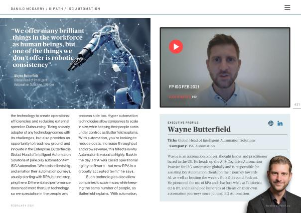 Wayne is an automation pioneer , thought leader and practitioner based in the UK . He heads up the AI & Cognitive Automation Practice for ISG Automation globally and is responsible for assisting ISG Automation clients on their journey towards AI , as well as hosting the weekly Bots & Beyond Podcast . He pioneered the use of RPA and chat bots while at Telefonica O2 & BT , and has helped hundreds of Clients on their own automation journeys since joining ISG Automation . businesschief . eu