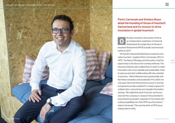 “ At that time Generali Switzerland created an innovation function ,” explains Pietro Carnevale , CEO of HITS . “ As Head of Strategy and Innovation , I had the opportunity to introduce new working methods . The insurance industry also realised that , in order to make innovation even more valuable and sustainable , it had to open up and start collaborating with new varieties of partners .” What followed was a partnership with the fintech incubator and accelerator F10 , which not only gave Generali Switzerland access to startup ecosystems but also enabled it to create a space for collaboration , networking and valuable information sharing . “ We called the result ‘ Corp Up ’, and its success led the company to research the potential for improving its ecosystem , capacity for innovation and scaling capabilities ten-fold . HITS was the answer ,” states Carnevale . This was the birth of HITS as an independent entity .