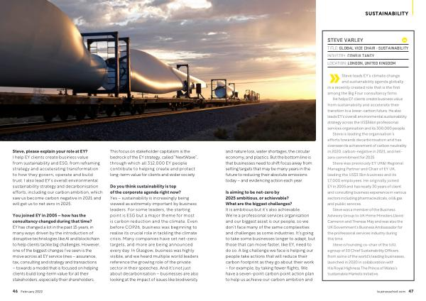 Steve , please explain your role at EY ? I help EY clients create business value from sustainability and ESG , from reframing strategy and accelerating transformation to how they govern , operate and build trust . I also lead EY ’ s overall environmental sustainability strategy and decarbonisation efforts , including our carbon ambition , which saw us become carbon negative in 2021 and will get us to net zero in 2025 .