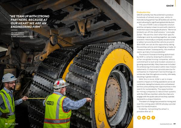 The use of ASW is also a bespoke solution and the company is keen to work with clients to meet their exact mining specifications . “ We ' re not limited to an off-the-shelf solution ,” concludes Zoltan . “ We ask the client what their specific challenge is and , by working together , we create a solution . Historically a company would choose a rubber tyre and build the vehicle around it . With ASW , we can do the opposite by taking the existing vehicle and integrating a made-to -measure wheel . Subsequently , this method opens up many more possibilities .”