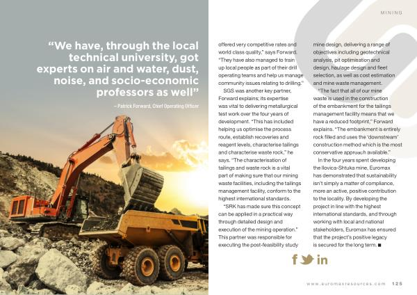 In the four years spent developing the Ilovica-Shtuka mine , Euromax has demonstrated that sustainability isn ’ t simply a matter of compliance , more an active , positive contribution to the locality . By developing the project in line with the highest international standards , and through working with local and national stakeholders , Euromax has ensured that the project ’ s positive legacy is secured for the long term . www . euromaxresources . com 125