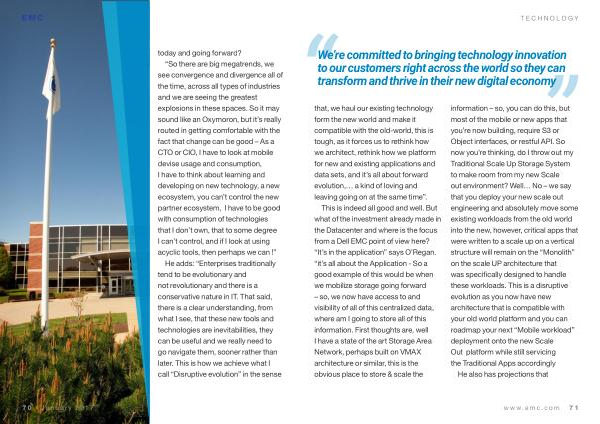 EMC today and going forward ? “ So there are big megatrends , we see convergence and divergence all of the time , across all types of industries and we are seeing the greatest explosions in these spaces . So it may sound like an Oxymoron , but it ’ s really routed in getting comfortable with the fact that change can be good – As a CTO or CIO , I have to look at mobile devise usage and consumption , I have to think about learning and developing on new technology , a new ecosystem , you can ’ t control the new partner ecosystem , I have to be good with consumption of technologies that I don ’ t own , that to some degree I can ’ t control , and if I look at using acyclic tools , then perhaps we can !”