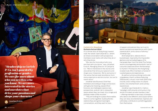 Jonathan says Carlyle & Co . marks a “ paradigm shift around community in the world of modern private member clubs ” – offering members a sanctuary of people who dare to be different , and a space where they can relax , be entertained , inspired , and ultimately contribute to something greater than themselves . businesschief . com 79