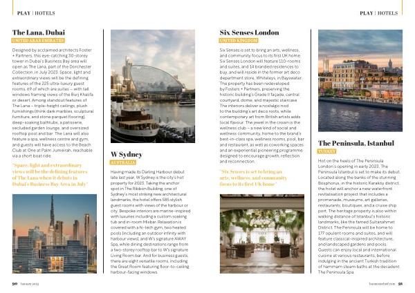 Designed by acclaimed architects Foster + Partners , this eye-catching 30-storey tower in Dubai ’ s Business Bay area will open as The Lana , part of the Dorchester Collection , in July 2023 . Space , light and extraordinary views will be the defining features of the 225 ultra-luxury guest rooms , 69 of which are suites – with tall windows framing views of the Burj Khalifa or desert . Among standout features of The Lana – triple-height ceilings , plush furnishings ( think dark marbles , sculptural furniture , and stone parquet flooring ), deep-soaking bathtubs , a patisserie , secluded garden lounge , and oversized rooftop pool and bar . The Lana will also feature a spa , wellness centre and gym , and guests will have access to the Beach Club at One at Palm Jumeirah , reachable via a short boat ride .