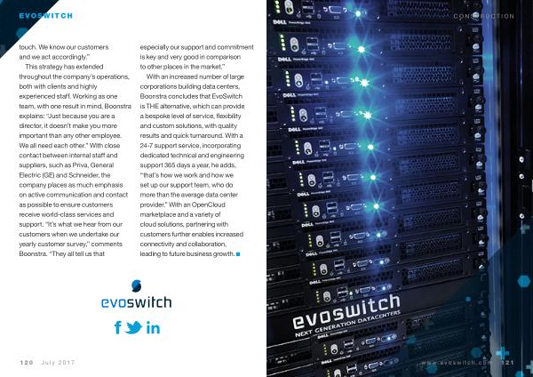 With an increased number of large corporations building data centers , Boonstra concludes that EvoSwitch is THE alternative , which can provide a bespoke level of service , flexibility and custom solutions , with quality results and quick turnaround . With a 24-7 support service , incorporating dedicated technical and engineering support 365 days a year , he adds , “ that ’ s how we work and how we set up our support team , who do more than the average data center provider .” With an OpenCloud marketplace and a variety of cloud solutions , partnering with customers further enables increased connectivity and collaboration , leading to future business growth .