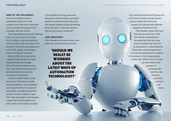 The Chartered Institute of Ergonomics and Human Factors and job seeker and recruiting site CV Library present a fundamentally different outlook to the likes of PwC . Their studies reveal that more than 63 percent of the 1,000 UK industry professionals surveyed say that they have never witnessed job cuts due to automation or robot takeover . More than a third revealed that this had actually led to the creation of more jobs in their organisations . Further still , CIEHF and CV Library say that nearly three quarters of professionals hold the view that they and other workers are being