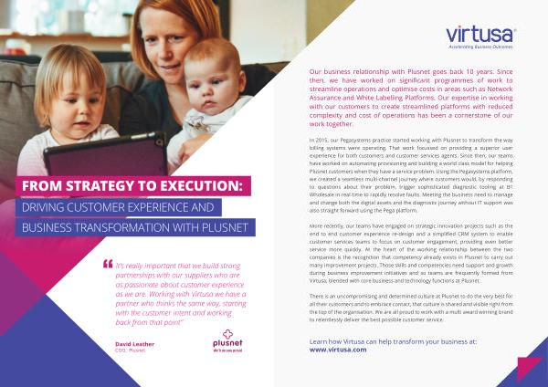 In 2015 , our Pegasystems practice started working with Plusnet to transform the way billing systems were operating . That work focussed on providing a superior user experience for both customers and customer services agents . Since then , our teams have worked on automating provisioning and building a world class model for helping Plusnet customers when they have a service problem . Using the Pegasystems platform , we created a seamless multi-channel journey where customers would , by responding to questions about their problem , trigger sophisticated diagnostic tooling at BT Wholesale in real time to rapidly resolve faults . Meeting the business need to manage and change both the digital assets and the diagnostic journey without IT support was also straight forward using the Pega platform .