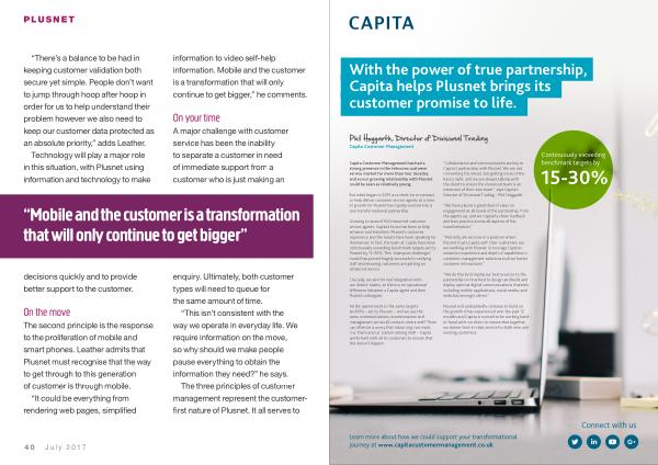 “ Not only are we now in a position where Plusnet trusts Capita with their customers , we are working with Plusnet to leverage Capita ’ s extensive experience and depth of capabilities in customer management solutions to drive better customer interactions .”