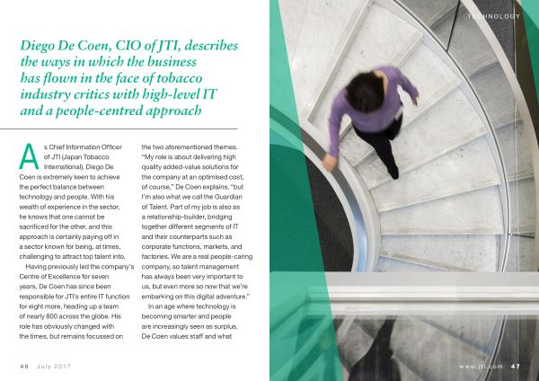 As Chief Information Officer of JTI ( Japan Tobacco International ), Diego De Coen is extremely keen to achieve the perfect balance between technology and people . With his wealth of experience in the sector , he knows that one cannot be sacrificed for the other , and this approach is certainly paying off in a sector known for being , at times , challenging to attract top talent into .