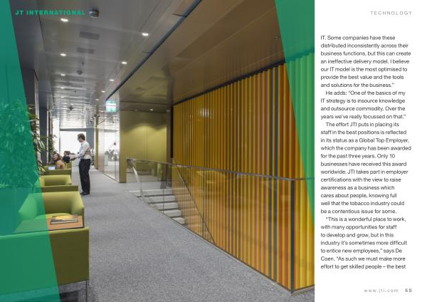 He adds : “ One of the basics of my IT strategy is to insource knowledge and outsource commodity . Over the years we ’ ve really focussed on that .” The effort JTI puts in placing its staff in the best positions is reflected in its status as a Global Top Employer , which the company has been awarded for the past three years . Only 10 businesses have received this award worldwide . JTI takes part in employer certifications with the view to raise awareness as a business which cares about people , knowing full well that the tobacco industry could be a contentious issue for some .
