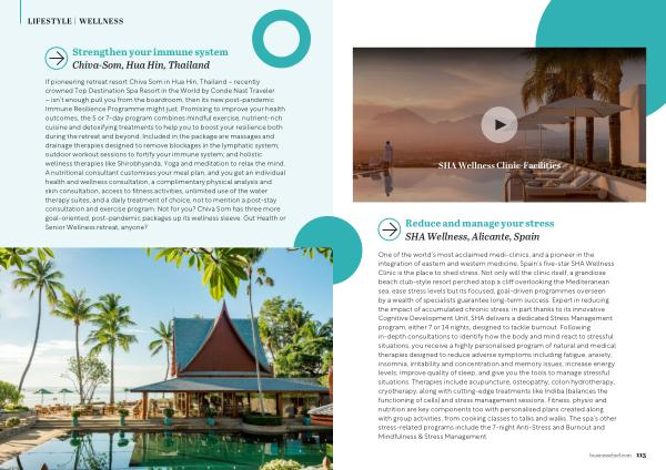 One of the world ’ s most acclaimed medi-clinics , and a pioneer in the integration of eastern and western medicine , Spain ’ s five-star SHA Wellness Clinic is the place to shed stress . Not only will the clinic itself , a grandiose beach club-style resort perched atop a cliff overlooking the Mediteranean sea , ease stress levels but its focused , goal-driven programmes overseen by a wealth of specialists guarantee long-term success . Expert in reducing the impact of accumulated chronic stress , in part thanks to its innovative Cognitive Development Unit , SHA delivers a dedicated Stress Management program , either 7 or 14 nights , designed to tackle burnout . Following in-depth consultations to identify how the body and mind react to stressful situations , you receive a highly personalised program of natural and medical therapies designed to reduce adverse symptoms including fatigue , anxiety , insomnia , irritability and concentration and memory issues ; increase energy levels ; improve quality of sleep , and give you the tools to manage stressful situations . Therapies include acupuncture , osteopathy , colon hydrotherapy , cryotherapy , along with cutting-edge treatments like Indiba ( balances the functioning of cells ) and stress management sessions . Fitness , physio and nutrition are key components too with personalised plans created along with group activities , from cooking classes to talks and walks . The spa ’ s other stress-related programs include the 7-night Anti-Stress and Burnout and Mindfulness & Stress Management . businesschief . com 113