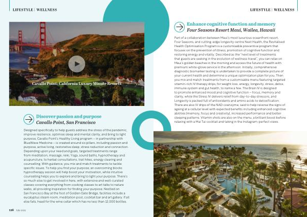 Part of a collaboration between Maui ’ s most luxurious oceanfront resort , Four Seasons , and cutting-edge longevity centre Next Health , the Revitalised Health Optimisation Program is a customisable preventive program that focuses on the prevention of illness , promotion of cognitive function and restoring energy and vitality . Described as the “ next level of treatments that guests are seeking in the evolution of wellness travel ”, you can relax on Maui ’ s golden beaches in the morning and access the future of health with premium white-glove service in the afternoon . Initially , comprehensive diagnostic biomarker testing is undertaken to provide a complete picture of your current health and determine a unique optimisation plan for you . Then you mix and match treatments from a customisable menu featuring targeted vitamin-rich IV therapy drips , for weight loss , energy , longevity , stress , detox , immune system and gut health , to name a few . The Brain IV is designed to promote enhanced mood and cognitive function – focus , memory and clarity , while the Stress IV delivers relief from day-to-day stressors , and Longevity is packed full of antioxidants and amino acids to detoxification . There are also IV drips of the NAD coenzyme , said to help reverse the signs of ageing at a cellular level with expected benefits including enhanced cognitive abilities ( memory , focus and creativity ), increased performance and better sleeping patterns . Vitamin shots are also on the menu , a brilliant boost before relaxing with a Mai Tai cocktail and taking in the Instagram-perfect views .