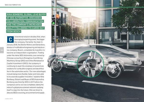 C onventional wisdom dictates that , when leveraging bargaining power , the bigger the company , the better the deal . In January 2018 , the Starter Motors and Generators division of multinational engineering and electronics company , Bosch , completed its transition to become an independent organisation . Trading under the name SEG Automotive , now owned by Chinese consortium Zhengzhou Coal Mining Machinery Group ( ZMJ ) and China Renaissance Capital Investment ( CRCI ), the company is continuing to push the envelope of powertrain solutions for combustion engines and electrification in the automotive sector . “ Our new advantages include being more flexible , faster and more able to incorporate supplier innovation ,” explains Nina Bomberg , Global Lead Buyer at SEG Automotive . Bomberg was hired by SEG in 2017 before the company ’ s carve-out was completed , taking the reins of a global procurement network readying itself to step into the future . She sat down to discuss SEG ’ s sourcing , procurement and supply