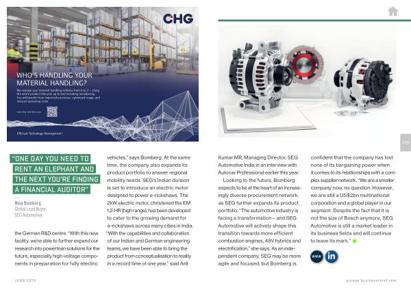 Kumar MR , Managing Director , SEG Automotive India in an interview with Autocar Professional earlier this year . Looking to the future , Bomberg expects to be at the heart of an increasingly diverse procurement network , as SEG further expands its product portfolio . “ The automotive industry is facing a transformation – and SEG Automotive will actively shape this transition towards more efficient combustion engines , 48V hybrids and electrification ,” she says . As an independent company , SEG may be more agile and focused , but Bomberg is confident that the company has lost none of its bargaining power when it comes to its relationships with a complex supplier network . “ We are a smaller company now , no question . However , we are still a US $ 2bn multinational corporation and a global player in our segment . Despite the fact that it is not the size of Bosch anymore , SEG Automotive is still a market leader in its business fields and will continue to leave its mark .”