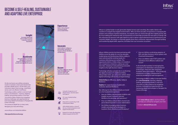 Infosys Utilities practice has been partnering with Utilities across the globe for over two decades , modernizing and transforming Utilities ability to meet and exceed the evolving needs of a customer while being ever resilient . The opportunity before a Utility today is to transform into a responsive enterprise – soaking up a real time data , analyzing it and publishing actionable insights to the right decision-makers .