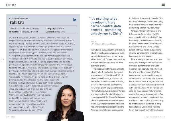 Ms . Yali Z . Liu joined Chayora in 2020 as Executive Vice President responsible for network connectivity products and solutions , as well as business strategy , being a member of the management board of Chayora , supporting delivery of large scalable high performance data centre campuses in China . Yali has over 15 years of strategic and operational leadership experience in global internet , cloud and data centre development , driving transformation and supporting business and customer demands worldwide . Yali was Executive Director at Verizon , responsible for global network planning , engineering and network product development , leading large geographically dispersed global teams to provide development and operational support for innovative product portfolios while aligning technology strategy with business and financial objectives . Between 2014-19 , Yali was Vice President of ChinaCache responsible for global business development . She was instrumental in driving carrier-neutral data centres and building the first internet exchange ( CHN-IX ) in mainland China for more effective regional connectivity among cloud and data service providers and ISPs . Yali holds a B . S . in Mathematics from Peking University , an MBA from University of Dallas , and an M . S . in Computer Sciences from University of Texas in Dallas . Yali has a US patent in internet technology , and is an advisory board member of the Pacific Telecommunications Council ( PTC ).