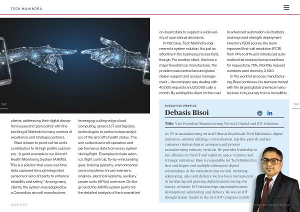 Bisoi is keen to point out his unit ’ s contribution to its high profile customers . “ A good example is our Aircraft Health Monitoring System ( AHMS ). This is a solution that uses real-time data captured through integrated sensors on aircraft parts to enhance reliability and safety .” Among many clients , the system was adopted by a Canandian aircraft manufacturer , leveraging cutting-edge cloud computing , sensor , IoT and big data technologies to perform deep analytics of the aircraft ’ s health status . The unit collects aircraft operation and performance data from every system during flight . Examples include avionics , flight controls , fly-by-wire , landing gear , braking systems , environmental control systems , thrust reversers , engines , electrical systems , auxiliary power units ( APUs ) and more . On the ground , the AHMS system performs the detailed analysis of the transmitted