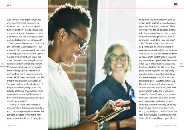 BCX works with its customers to help them gain an understanding of potential avenues for digital transformation , and how that can be integrated into an appropriate cost structure . “ I always say to customers , you have to be careful when you ’ re thinking about transformation ,” says Goliath . “ It ’ s a lot more than just a simple upgrade . The capability available today is much broader than a single solution you may think you need to have in place .” Take for example Big Data - the elements of volume , variety , and velocity at which data is generated and available today ( the well known “ three V ’ s of data ”) means companies that want to benefit from data insight need to develop strategies around analytics , machine learning , and deep learning . We have developed a very strong capability not only in this area , but in all the vital layers of digital transformation , including cloud based technologies ,