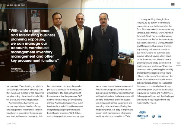 It is very exciting , though challenging , to be part of a continually expanding group that dominates the East African market in a number of key verticals , says Kumar . “ Our Chairman , Subhash Patel , has a simple mantra : there are three ‘ Ms ’ at the core of any successful business , Money , Mindset and Manpower . Our people find this a great way to focus our minds on our work . Clearly no business can survive without having a firm hand on its finances ; then it has to have a clear vision and finally a committed and competent workforce .” Patel is a person of vision , retaining his humility and empathy , despite being a figure of huge influence in Tanzania and the wider African business world , Kumar acknowledges . Under his leadership the group is constantly diversifying and adding new products to the existing divisions . Kumar and his team are fully equipped to accept the challenge of keeping these supplied with the materials they need .