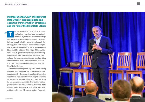 “ T o be a good Chief Data Officer is a true craft ; when I walk into an organisation I immerse myself in the business strategy and the detailed end-to-end business processes to know exactly what I ’ m going to implement , the strategy behind it , measure how well it ’ s going to unfold and the milestones to be hit ,” says Inderpal Bhandari , IBM ’ s Global Chief Data Officer . With more than 20 years of experience transforming industry-leading organisations , Bhandari has defined the scope , expectations , and deliverables of the modern Chief Data Officer role . Indeed , it wouldn ’ t be unreasonable to suggest he is the Chief Data Officer .