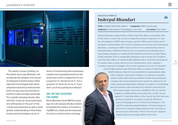 Inderpal Bhandari rejoined IBM as Global Chief Data Officer in December 2015 . In this newly created role , he has leveraged his extensive experience to lead the development of IBM ’ s data strategy and drive IBM ’ s internal data and AI enterprise transformation . The work has culminated in the Data and AI Enterprise Blueprint ; a roadmap for IBM ’ s clients on their own transformation journeys . Inderpal brings to IBM more than 20 years of experience in leadership roles at such leading companies as Cambia Health Solutions and Express Scripts / Medco Health Solutions . Prior to joining IBM , Inderpal served as Senior Vice President and Chief Data Officer of Cambia Health Solutions where he led the development of Cambia ’ s data strategy and drove the transformation of the company ’ s consumer experience strategies . Prior to that , Inderpal served as Vice President of knowledge solutions and Chief Data Officer at Express Scripts / Medco Health Solutions , where he was responsible for maximizing the utility of the company ’ s data and its readiness to respond to emerging market trends . Before that , he founded Virtual Gold , growing the company into an international market leader for analytics in call centers and professional sports . Inderpal is an expert in transforming data into business value and improved customer experiences by delivering strategic , innovative capabilities that use analytic insights to enable growth and productivity . In 2017 , he was named U . S . Chief Data Officer of the Year by the CDO Club , and has been featured as an industry expert by Wall Street Journal , Washington Post , US News & World Report , CNN and FOX . Inderpal earned his Master of Science Degree in Electrical & Computer Engineering from the University of Massachusetts and holds a PhD in Electrical & Computer Engineering from Carnegie Mellon University .