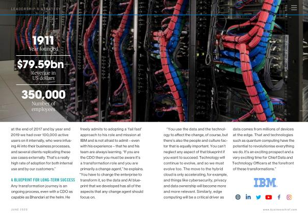 Any transformation journey is an ongoing process , even with a CDO as capable as Bhandari at the helm . He freely admits to adopting a ‘ fail fast ’ approach to his role and mission at IBM and is not afraid to admit – even with his experience – that he and his team are always learning . “ If you are the CDO then you must be aware it ’ s a transformation role and you are primarily a change agent ,” he explains . “ You have to change the enterprise to transform it , so the data and AI blueprint that we developed has all of the aspects that any change agent should focus on .