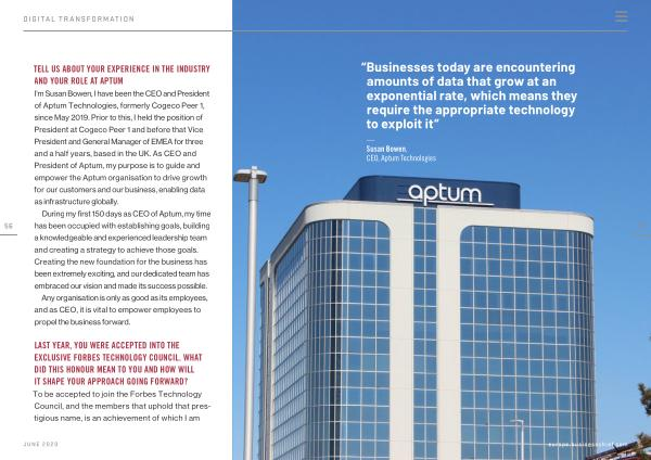 I ’ m Susan Bowen , I have been the CEO and President of Aptum Technologies , formerly Cogeco Peer 1 , since May 2019 . Prior to this , I held the position of President at Cogeco Peer 1 and before that Vice President and General Manager of EMEA for three and a half years , based in the UK . As CEO and President of Aptum , my purpose is to guide and empower the Aptum organisation to drive growth for our customers and our business , enabling data as infrastructure globally .