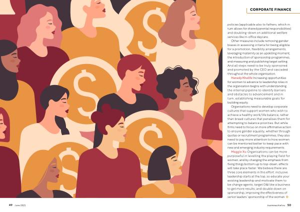 Maggie Xu Organisations can be more purposeful in levelling the playing field for women , and by changing the emphasis from fixing things bottom up to top-down , effects will take place faster . We believe there are three core elements in this effort : inclusive leadership starts at the top , so educate your existing leadership and motivate them to be change agents ; target D & I like a business to get more results ; and double down on sponsorship , improving the effectiveness of senior leaders ’ sponsorship of the women .