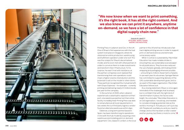 Printing Press in Lebanon and Cloc in the UK . One of Shaun ’ s first experiences with the hub system took place in Singapore , where he observed an entire production , warehousing and fulfilment operation under one roof . This was the catalyst for Shaun ’ s decentralised model , and he soon met with other partners in order to convince them to make investments and transform their infrastructure . To his surprise , he wasn ’ t met with resistance , as the partner companies soon realized that transforming their own operations could mean a higher volume of production and the potential to sell on the model to other clients . These partners recognized the mutual benefit , with Grupo Espinosa – for example - currently printing and delivering nearly 1.5 million books per year for the company .