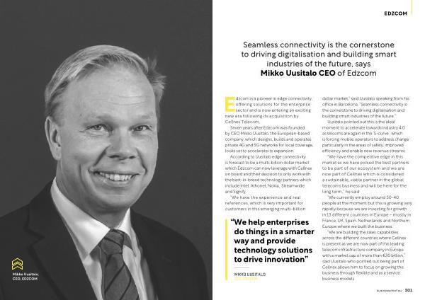 “ We are building the sales capabilities across the different countries where Cellnex is present as we are now part of this leading telecom infrastructure company in Europe with a market cap of more than € 30 billion ,” said Uusitalo who pointed out being part of Cellnex allows him to focus on growing the business through flexible and as a service business models . businesschief . eu 301