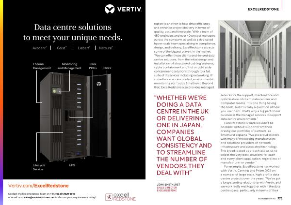 EXCELREDSTONE region to another to help drive efficiency and enhance project delivery in terms of quality , cost and timescale : ‘ With a team of 450 engineers and over 40 project managers across the company , as well as a dedicated hyper-scale team specialising in compliance , design , and delivery , ExcelRedstone attracts some of the biggest players in the market . “ We can offer these clients end-to-end data centre solutions , from the initial design and installation of structured cabling systems , cable containment and hot or cold aisle containment solutions through to a full suite of IP services including networking , IP surveillance , access control , environmental monitoring etc .” adds Smethurst . Beyond that , ExcelRedstone also provides managed