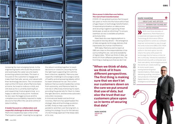 A leader focused on collaboration and respectful challenge to drive tech change Mamone ' s leadership style is that of the ' Participative Leader ', meaning he recognises the value in working together to reach decisions on solutions , ensuring he has the right team supporting him with the best collective capability . Mamone uses respectful challenge to encourage a sense of healthy and empowering debate within his team whenever he can . He is a firm believer that successful leadership comes from autonomy , and Mamone feels his role lies in effectively mentoring his team , providing the guide rails for them to make the right decisions , and becomes autocratic only when necessary . A motivational leader and technical visionary , Mamone has spearheaded the strategic data and technology evolution at GBG , firstly to help cope with the pandemic and then over the long term , is setting the strategic focus for the delivery of a technology approach that keeps data at its core .