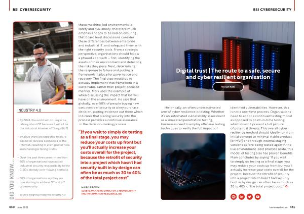 Source : bsigroup Insigvhts Industry 4.0 these machine-led environments is safety and availability , therefore much emphasis needs to be laid on ensuring that board level discussions consider these differences between enterprise and industrial IT , and safeguard them with the right security tools . From a strategic perspective , organisations should follow a phased approach – first , identifying the assets of their environment and detecting the risks they pose . Next , determining the response to failure and putting a framework in place for governance and recovery . The final step would be to actually implement that framework in a sustainable , rather than project-focused manner . Mark uses the example of when discussing the impact that IoT will have on the environment . He says that globally , over 50 % of people buying new cars consider security as a key purchase decision , putting evidence out there which indicates that placing security into the process provides a continual assurance in the decision-making process .