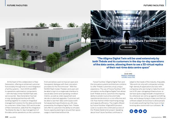 At the heart of this collaboration is New Generation , offering an enhanced customer functionality through end-to-end integration of all the systems – from DCIM and BMS to operations optimisation components – with the help of their NUVEA PaaS web service portal . New Generation has had a long-standing partnership with HPE , working together to create an integrated management solution for the data centre and its customers . Gilles Cieza , CEO and founder of New Generation , adds that this integration “ facilitates the day-to-day management of the data centre operations on the customerfront and allows users to have an open and transparent dialogue with their colocation providers for the first time ever ”. With the NUVEA PaaS model , Thésée ’ s end users will be able to log in to a single web interface to see all data centre and operating condition metrics , as well as order equipment and decide on planned upgrades . Customers will be able to see their data centre space with full equipment specifications as a 3D view , powered by the 6Sigma Digital Twin . Thésée will offer its customers the ability to simulate future capacity planning to ensure their space usage is maximised without risk .