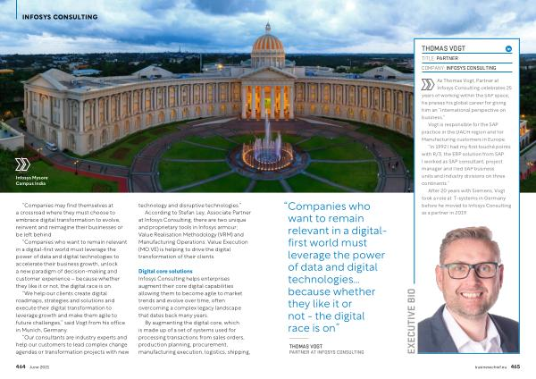After 20 years with Siemens , Vogt took a role at T-systems in Germany before he moved to Infosys Consulting as a partner in 2019 . businesschief . eu 465